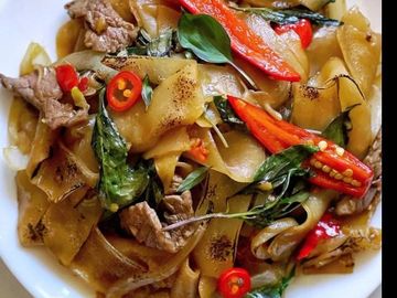 Thick noodles with egg, Chinese broccoli, in sweet dark soy sauce.