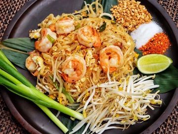 Thin noodles with egg, green onions, bean sprouts, in tamarind sauce.