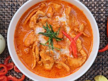 Red curry paste mix coconut milk, bell pepper, bamboo, carrots top with basil leaves and come with steamed rice.