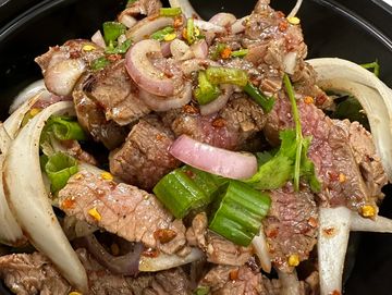 Grilled beef marinated mix with scallions cilantro served with side steamed rice.