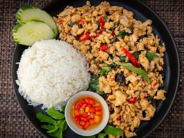 Ground chicken stir fried with larb sauce add on red crushed peppers green onions cilantro and scallions and served with steamed rice.