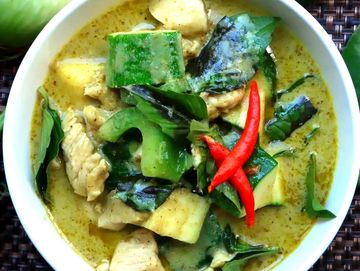 Green curry paste mix coconut milk, bell pepper, bamboo, zucchini, top with basil leaves and come with steamed rice.
