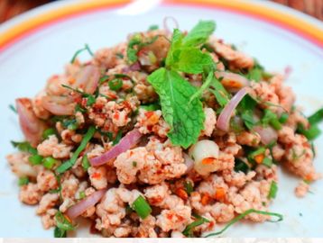 Fried chicken , sliced in to pieces mixed it well with LARB sauce red crushed pepper and scallions served with steamed rice
