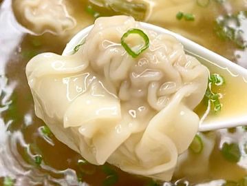 Homemade pork filled dumplings in seasoned chicken broth top with carrots and green onions